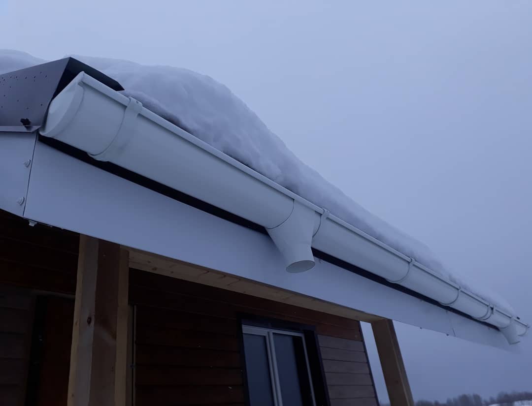 При монтаже водоотвода используется силикон. Путем обработки силиконом уплотнителей системе придается дополнительная прочность. В точке стока над отверстием для слива, в желобе, проделывается отверстие, торцы желоба укомплектовываются специальными заглушками.